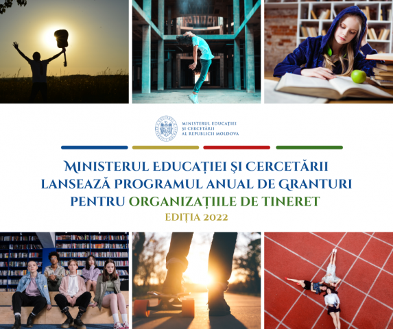În scopul susținerii şi dezvoltării sectorului de tineret din Republica Moldova, Ministerul Educației şi Cercetării lansează Programul anual de Granturi pentru organizațiile de tineret, ediția 2022. În cadrul acestuia se va oferi, în bază de concurs, suport logistic şi financiar pentru realizarea inițiativelor, programelor şi proiectelor de tineret.
